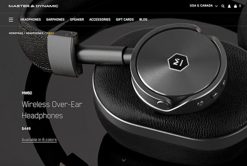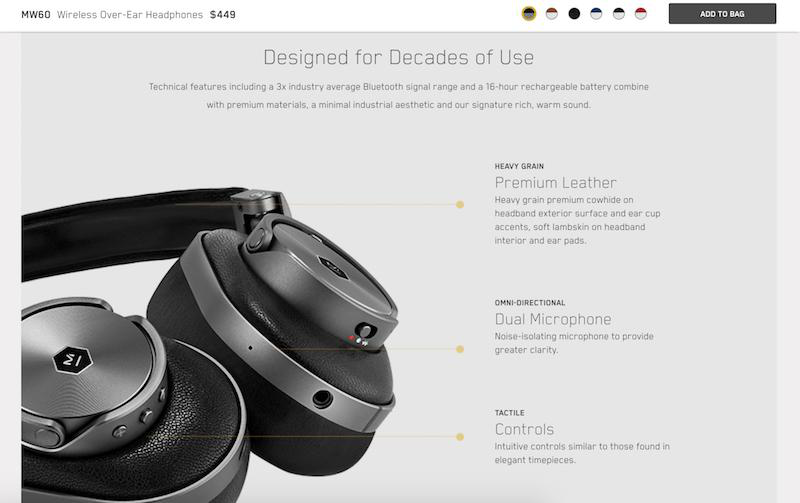 Master & Dynamic的产品页面给人一种亲身体验的感觉。当访客在滚动屏幕时,他们会看到更多关于耳机的细节设计——他们是由什么构成的、有哪些高级功能以及如何使用控制它们。
