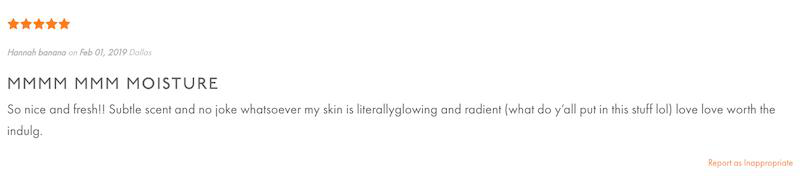 这个产品页面中特别引入注目的是其大胆的客户评价,其中一条评论的标题是:“MMMM MMM MOISTURE。”在考虑购买该产品的顾客脑海中,一条强有力的评论会给他们留下相当持久的印象。