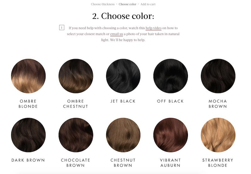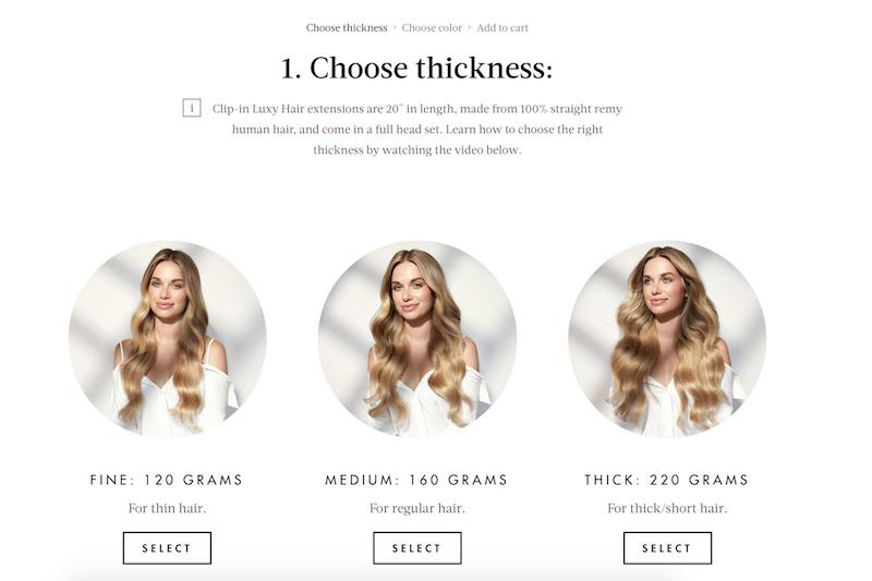 由于这类产品有许多不同变体,消费者首先需要选择他们头发的厚度,然后是颜色,接着就可以来到符合他们需求的特定产品页面。
