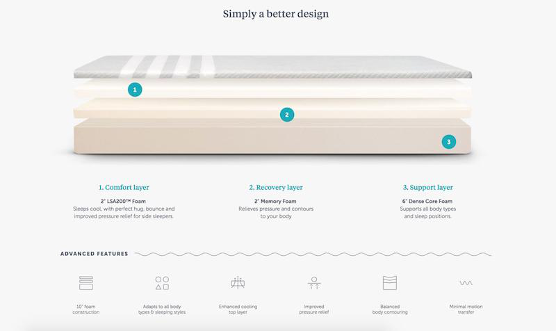 Leesa是一家可折叠、可运输的床垫公司。他们的品牌主打清爽干净,主要依赖于他们白色、蓝绿色和灰色的基调。许多类似的床垫公司已经涌现出来,所以Leesa直接切入主题,强调为什么你应该选择他们而不是其他人: