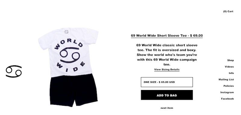 一旦你点击了某个产品,动态的图片将变为静态照片,并伴随着一个干净简洁的产品页面。同时还有一个链接可以查看产品尺码表,以确保顾客购买合适的尺寸。并且,当顾客是加拿大人时,那么通过一个按钮,他们就能前往加拿大站点购物。