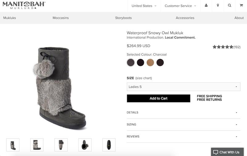 通过以下图片描述,顾客可以知道该品牌是本地企业(以及这意味着什么)以及他们靴子鞋底艺术背后的故事。如果页面的末尾有第二个“添加到购物车”按钮就更好了,这样,如果客户在浏览过程中决定购买,就不需要一直滚动到顶部。