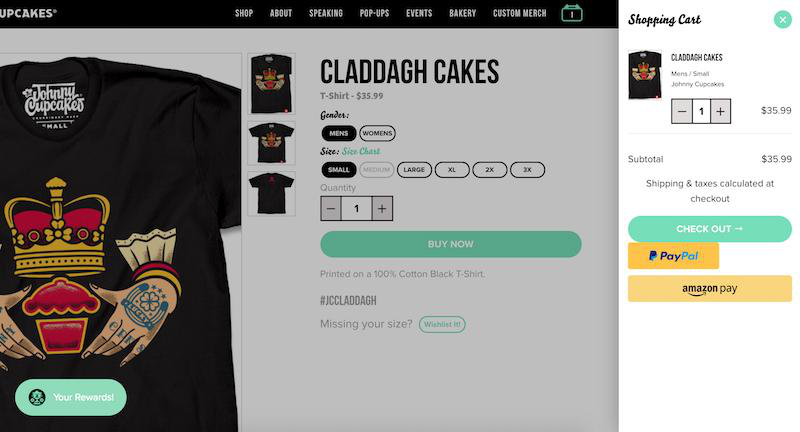 另外,当消费者点击“BUY NOW”按钮时,屏幕右侧会弹出购物车窗口,提醒买家可以随时结账。这是一个比较直观的交易未完成提醒,它清楚地表明了买家可以支付的方式。这将有效地将产品页面转换到结账页面,因此这也是加快购买过程的一种强有力的方法。