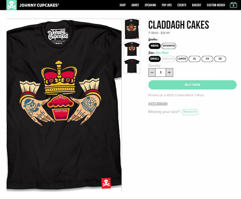Johnny Cupcakes是一个有趣的品牌,强调他们最近所有新品都是“新鲜烘焙的”。对于产品页面设计,他们充分利用了产品摄影,通过高质量的图片来展示其服装和有趣的设计。他们还给页面添加上加载动画效果,展示了一个胖乎乎的年轻人追逐着一个纸杯蛋糕,画面十分逗趣。