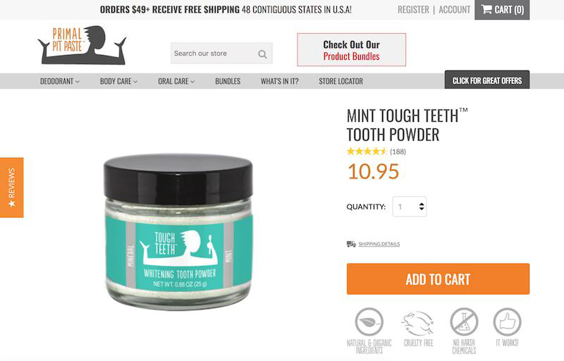 Primal Pit Paste充分利用了顾客评论部分,其在价格旁边和页面左侧始终存在的按钮中突出显示了这些评论。他们还在“Add to Cart”(添加到购物车)按钮旁边重申了产品拥有的优质成分和品质(天然的、有机的、无刺激性等等),以打消买家的任何犹疑不决。