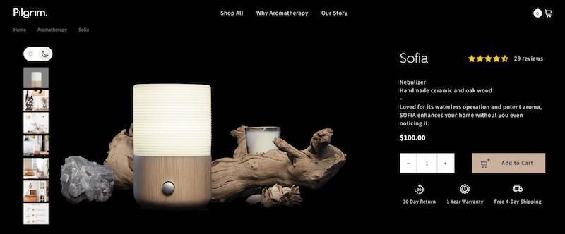 Pilgrim的网站采用了动态设计,提供日间和夜间两种模式,用户可以切身感受到他们的香薰产品放在自己家中的状态。