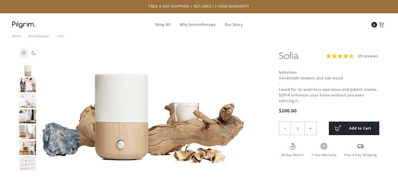 这个产品页面旨在减缓消费者普遍存在的购物焦虑——“免配送费”和“免费退货”用粗体大字写在购物车按钮旁。因为人们不喜欢在结账的时候看到多出了一些他们没有料想到的费用。