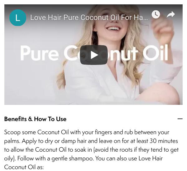 Love Hair是另一个专注于清洁产品的品牌,他们同样选择了整洁利落的产品页面设计。采用纯白色的背景,以灰色为衬托色,并略施些暗色调微妙地突出了产品图片。除产品图片外,Love Hair还运用了一些视频内容。在视频下方,Love Hair向用户分享了有关产品的更多内容以及他们将从中得到什么,让他们有机会直接指出受众的痛点所在。