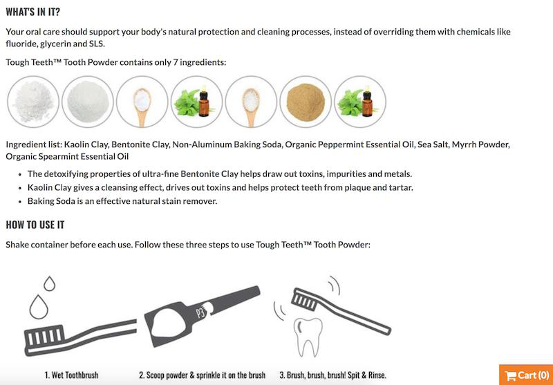 另外当买家向下滚动产品页面,他们还可以深入了解到产品成分以及如何使用非传统产品。Primal Pit Paste对图片和图形的用心设计延续了整个页面的趣味性,而且买家随时可以点击右下角的浮动按钮回到购物车结账。